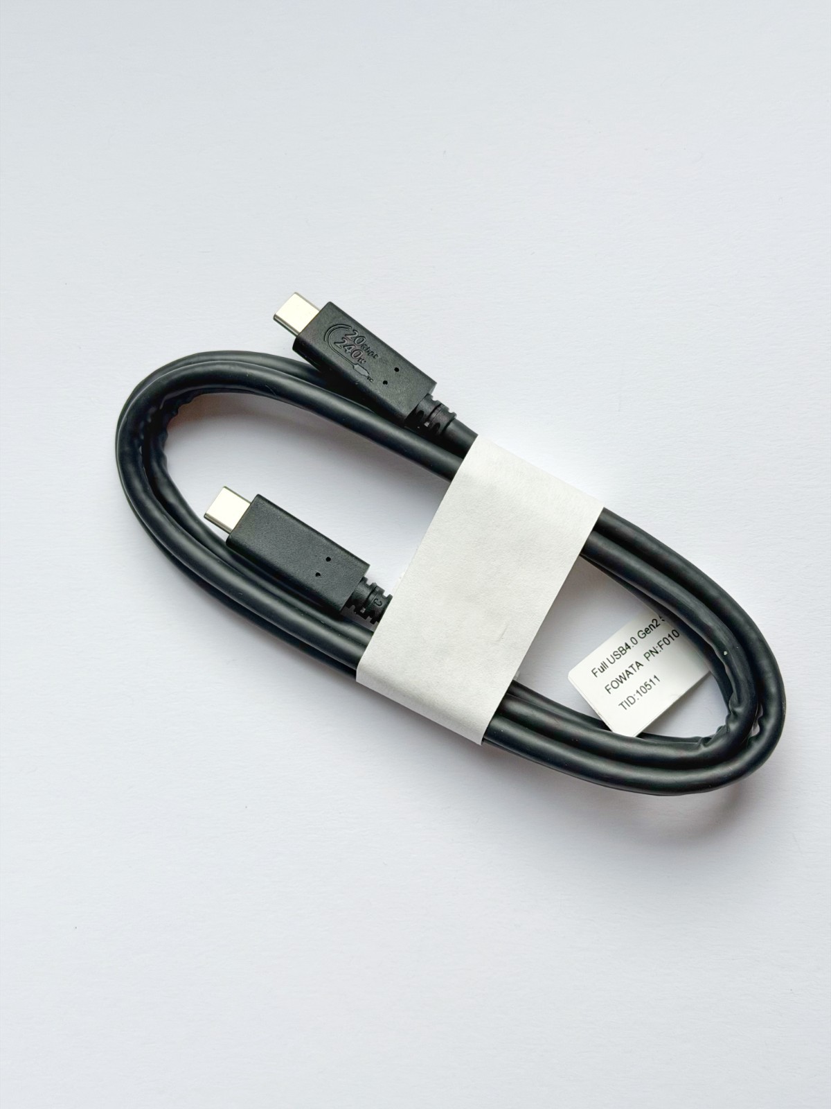 Anschluss: USB-C auf USB-C (Stecker/Stecker). Etikett: „Full USB4.0 Gen2“ (FOWATA PN: F010, TID: 10511). Bis zu 240 W (5 A) sind kabelseitig möglich; die tatsächliche Ladeleistung hängt von Netzteil/Monitor und Endgerät (USB-PD-Unterstützung) ab.