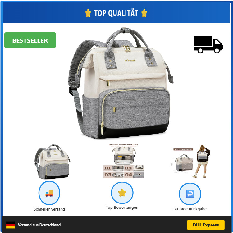 Er ist mit wasserabweisenden Eigenschaften ausgestattet und kann durch seine 2-in-1-Funktion zur Handtasche oder Reiserucksack umfunktioniert werden. Wir senden Ihnen ein vorfrankiertes Rücksendeetikett und Anweisungen.