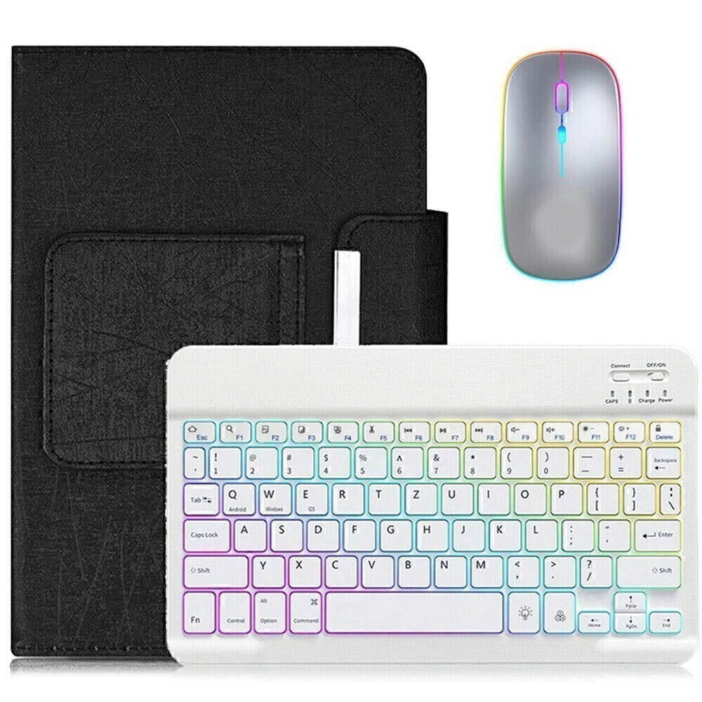 Leicht, kompakt, einfach zu tragen und zu handhaben. Die Reichweite beträgt bis zu 10m/33ft. RGB QWERTZ Tastatur mit Hintergrundbeleuchtung. Dies ist eine abnehmbare Bluetooth-Tastatur. Tastatur+Maus +Hülle.