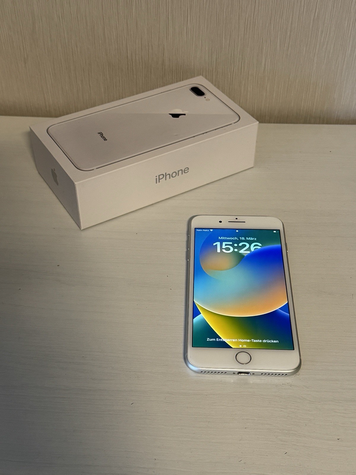Apple iPhone 8 Plus mit 64GB internen Speicher in einem eleganten Weiß/Silber. Das Gerät wird ohne Simlock geliefert und kommt zusätzlich mit der Originalverpackung, was es ideal für Sammler oder Nutzer macht. Das iPhone ist in einem gebrauchten, relativ guten Zustand. Auf der Rückseite ist wie auf den Fotos zu sehen ein kleiner Riss. Optisch sieht das Handy ansonsten gut aus und hat natürlich altersbedingt Gebrauchsspuren. Das Display ist noch top und wurde immer mit Schutzfolie benutzt. Zustand der Batterie: 80%