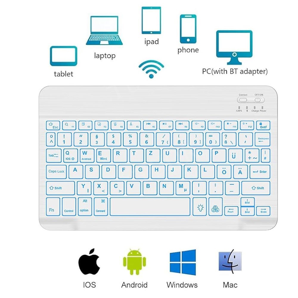 Bluetooth-Tastatur (QWERTZ) mit Beleuchtet. Hot Keys: Fn + Funktionstaste, drücken Sie Fn und die blauen Tasten auf der Tastatur. Schalten Sie das Bluetooth der Tastatur ein. Die Tastatur ist mit Bluetooth verbunden, die Maus ist mit Bluetooth verbunden (Ihr Gerät sollte die Bluetooth-Funktion unterstützen).