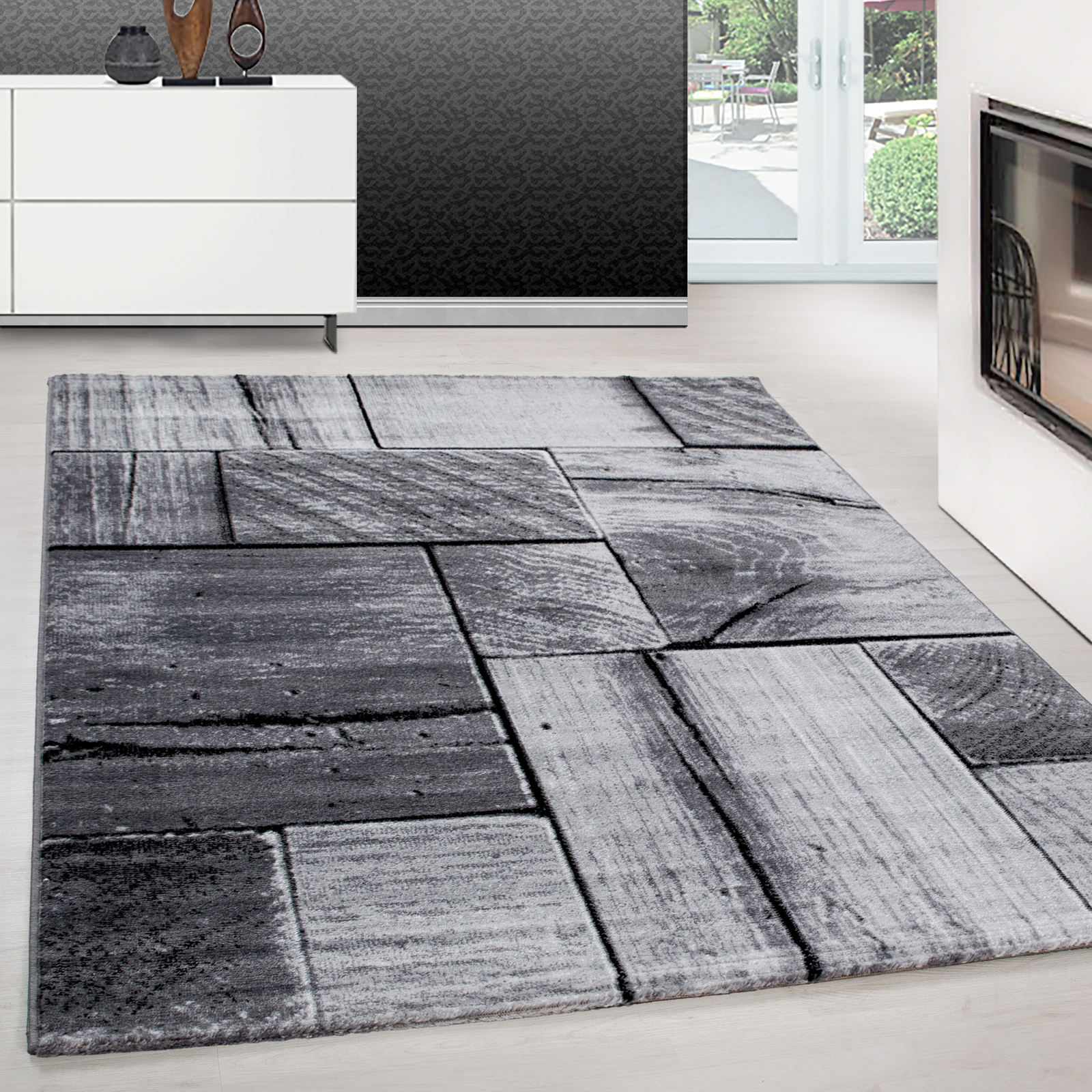 Modern Wohnzimmer Teppich Kurzflor Holz optik Design Schwarz-Grau, Pflegeleicht