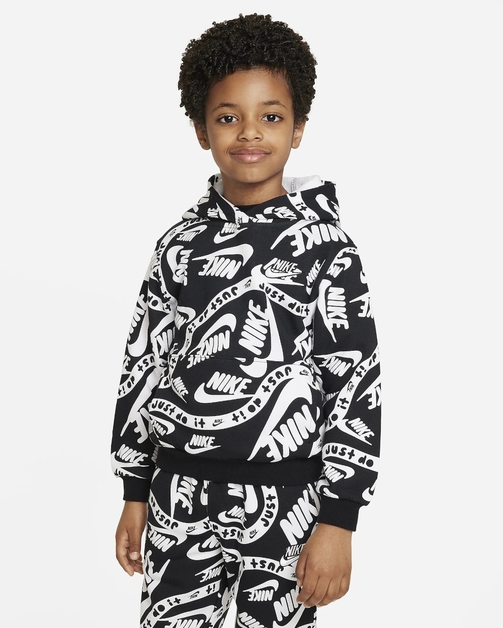 Sweat à capuche Nike PULLOVER Sportswear nsw club aop en coton noir et blanc pour enfants. Nike PULLOVER Sportswear nsw club aop Kids Cotton Black White Hoodie. Nike PULLOVER Sportswear nsw club aop Kinder Baumwolle Schwarz Weiß Hoodie.