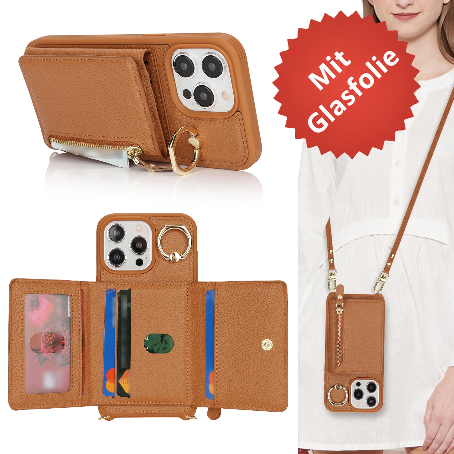 Handykette + Displayschutzfolie. 1x Handykette mit integrierten Kartenfächer und Münzfach sowie eine Ringhalterung (Verfügbar in 7 Farben). Material Hochwertiges Kunstleder - Diese Handytasche zum Umhängen ist gefertigt aus edlem, strapazierfähigem Kunstleder und verleiht ein luxuriöses Gefühl und langanhaltende Qualität.