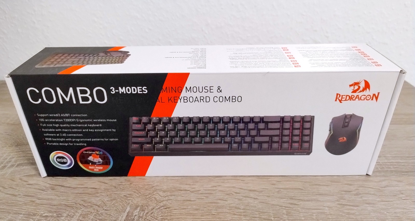 REDRAGON KS136. Makro-Unterstzütung aller 7 programmierbaren Maus-Tasten. ideale Balance zwischen Kompaktheit und 104-Tasten-Funktionalität. Maus mit 7200 DPI-Sensor und RGB-Beleuchtung. Maus-Empfindlichkeit in 5 Stufen (800/1200/1600/2400/7200 dpi).