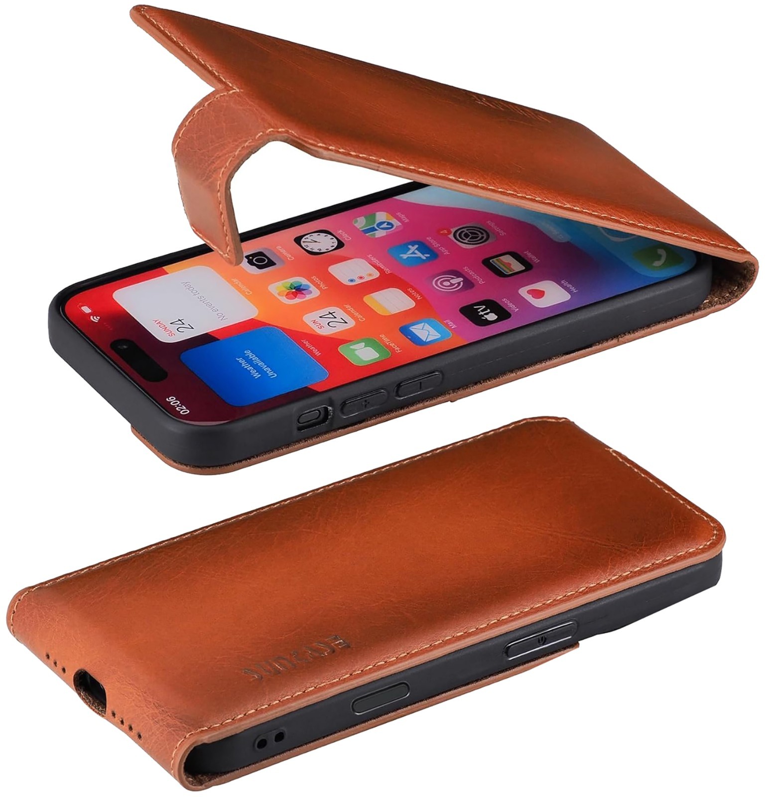 Suncase® Hülle Flip Style Echt Leder Tasche Klapp Case in Cognac für iPhone 16