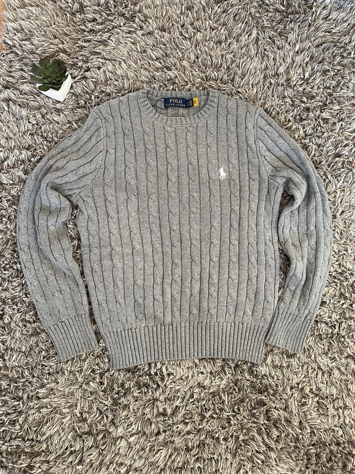 Polo Ralph Lauren Herren Pullover Grau M Zopfmuster Langarm Rundhals Logo