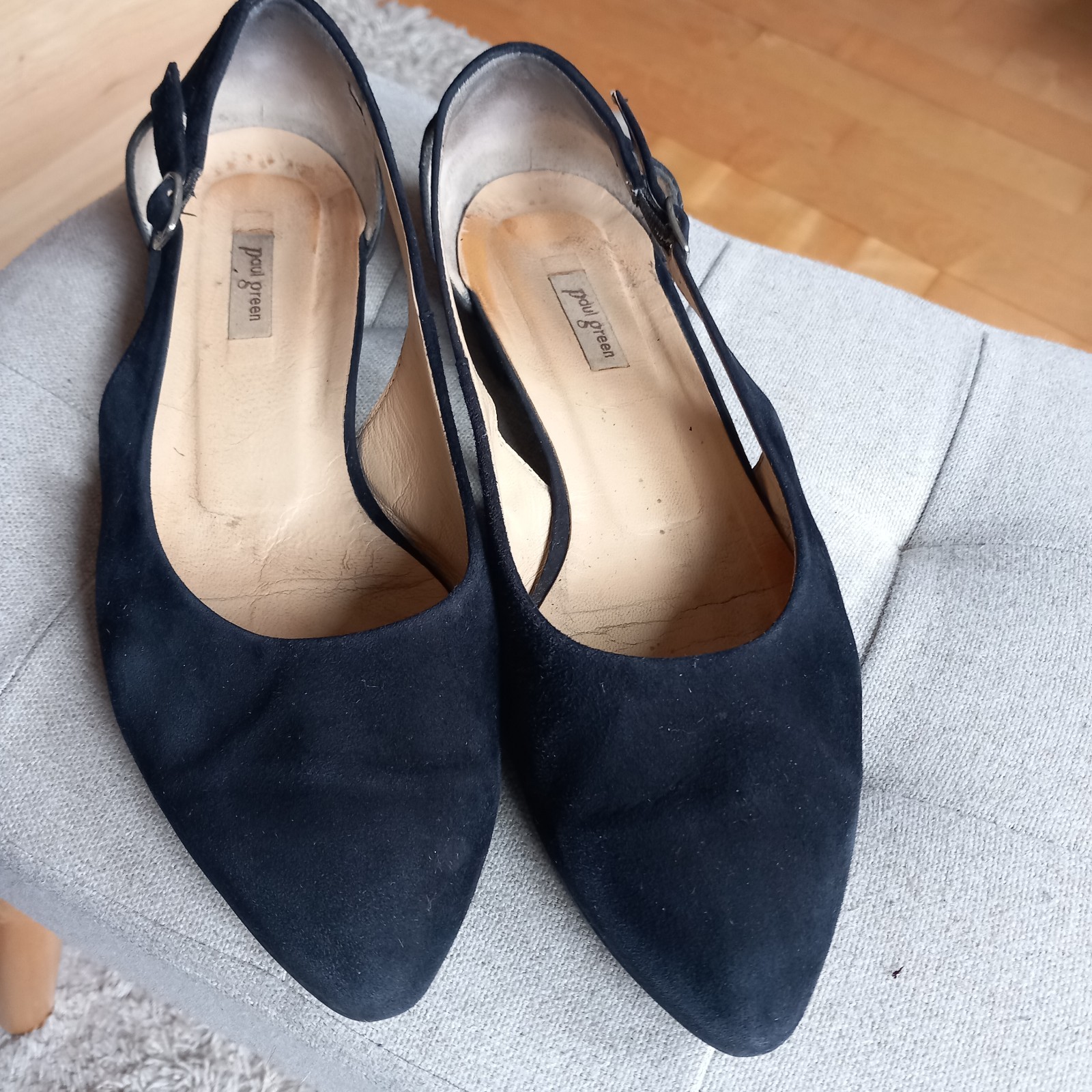 Moderne flache Schuhe für jeden Anlass sportlich bis elegant. An den Absätzen Gebrauchsspuren. Innensohle und Sohle Leder.