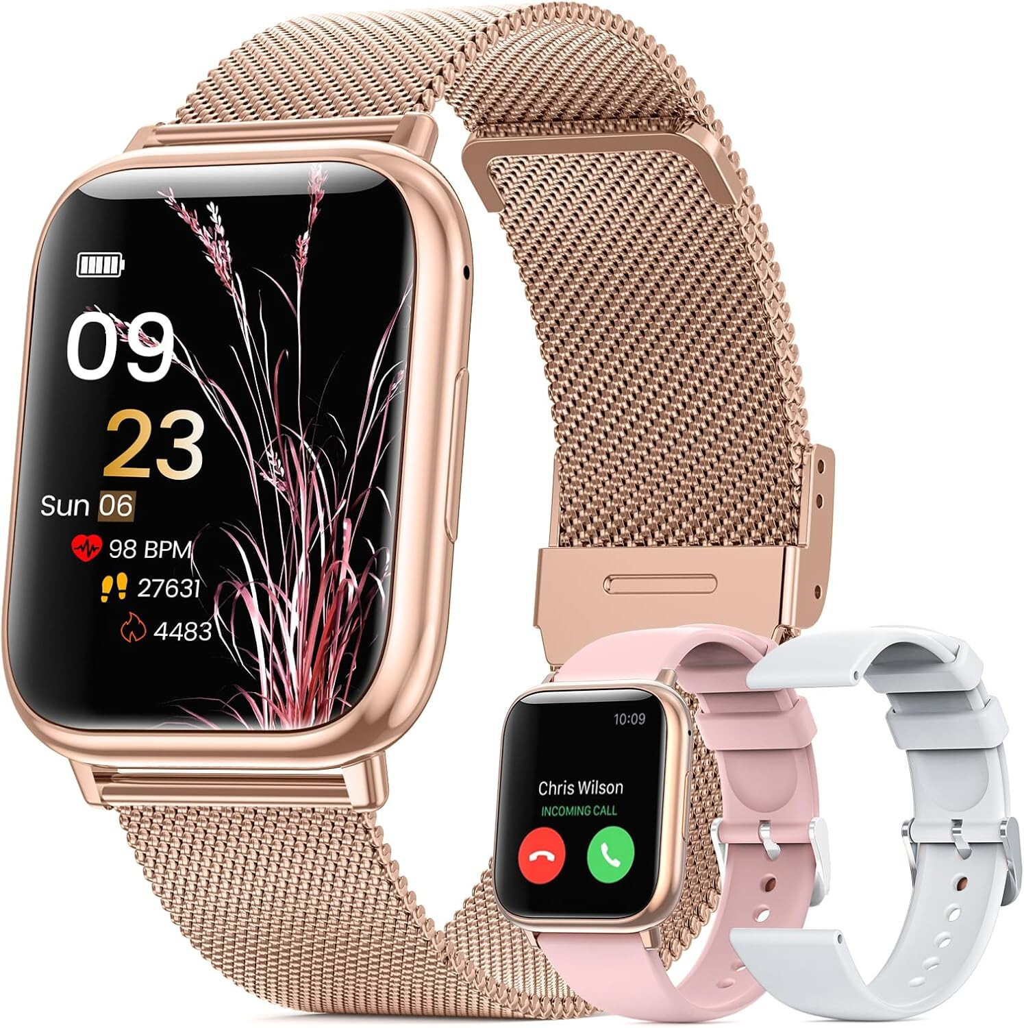 1 x Ladekabel. Roségoldenes Gehäuse mit roségoldenem Stahlband + 2 austauschbare Armbänder. Kompatibles System: unterstützt Android 5.0, iOS 9.0 und höher. Dank der Wasserdichtigkeit nach IP68 können Sie sich jederzeit ohne Angst vor Schweiß aufzeichnen.